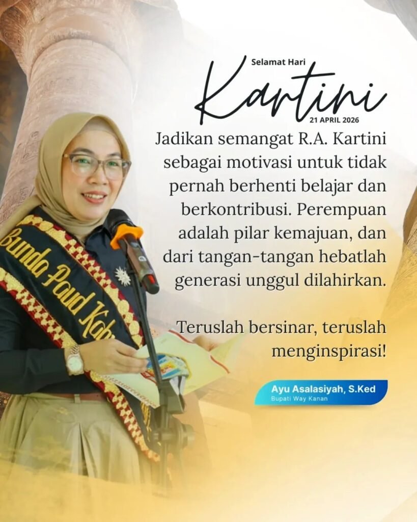 WAY KANAN – Bupati Way Kanan, Ayu Asalasiyah, S.Ked., menyampaikan pesan menyentuh dalam rangka memperingati Hari Kartini yang jatuh pada tanggal 21 April 2026. Melalui unggahan resmi di akun media sosial Prokopim Way Kanan, ia mengajak seluruh perempuan di Bumi Ramik Ragom untuk terus meneladani semangat perjuangan R.A. Kartini.